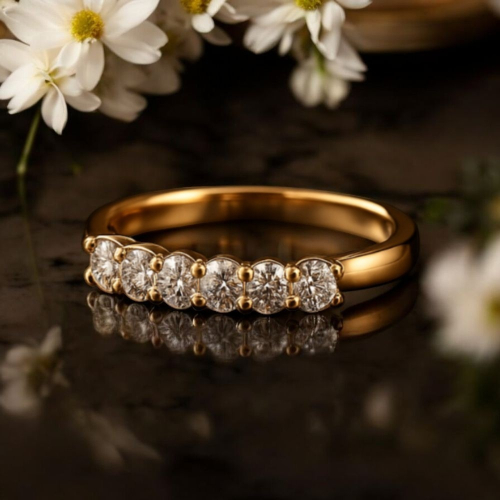 這款奢華的18K黃金鑽石戒指是專為追求優雅與品味的您而設計,採用高品質的18K金打造,並鑲嵌七顆璀璨的圓形切割鑽石,展現出無與倫比的奢華感。