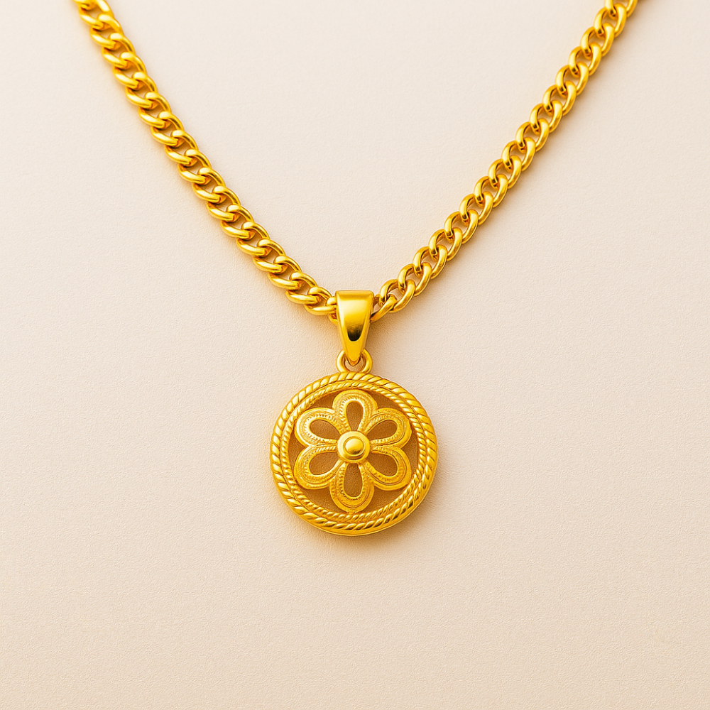 在每一個珍貴的時刻,我們都渴望擁有一件能夠展現個人風格與品味的飾品,而這款黃金花朵圓形吊墜項鍊正是如此,它以其精緻的花朵設計與圓形吊墜造型,完美展現了優雅與典雅的氣息。
