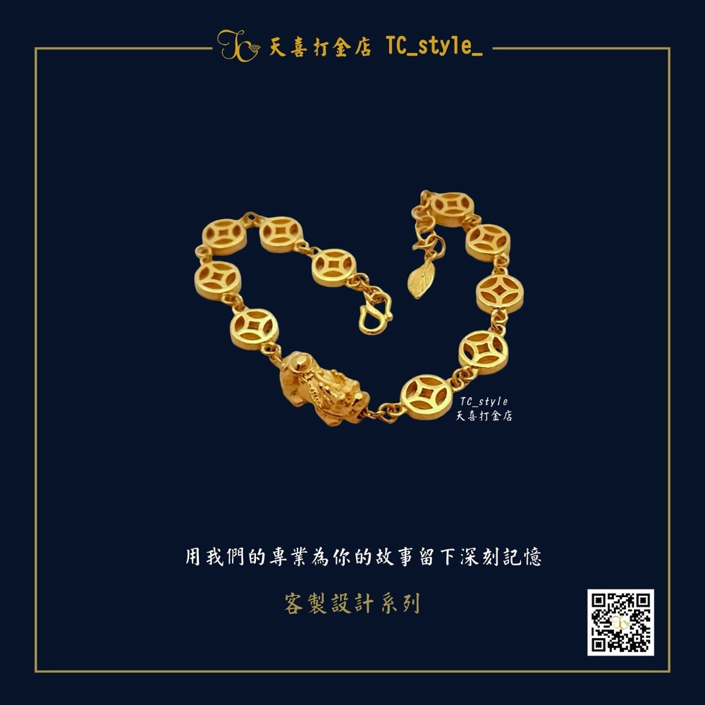 無論是在追求財富增長還是尋求心靈安定,這款‘黃金貔貅錢幣手鍊’都將成為您的理想選擇。現在就讓天喜打金店為您量身打造專屬的招財飾品,帶來滿滿的好運與幸福,讓每一個瞬間都充滿期待與祝福。
