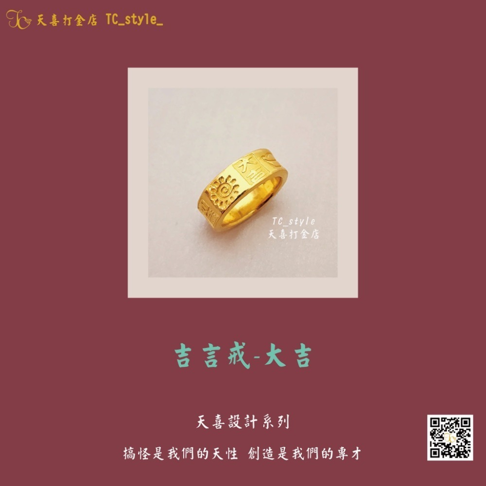 吉言戒-大吉黃金戒指是一款引人注目的璀璨選擇,將為您帶來無限的幸運與幸福。這款金飾完美結合了傳統的吉祥符號與現代設計美學,展現出獨特的魅力與風格,無論是作為結婚金飾還是訂製珠寶,皆能讓您在每一個重要時刻中閃耀奪目。
