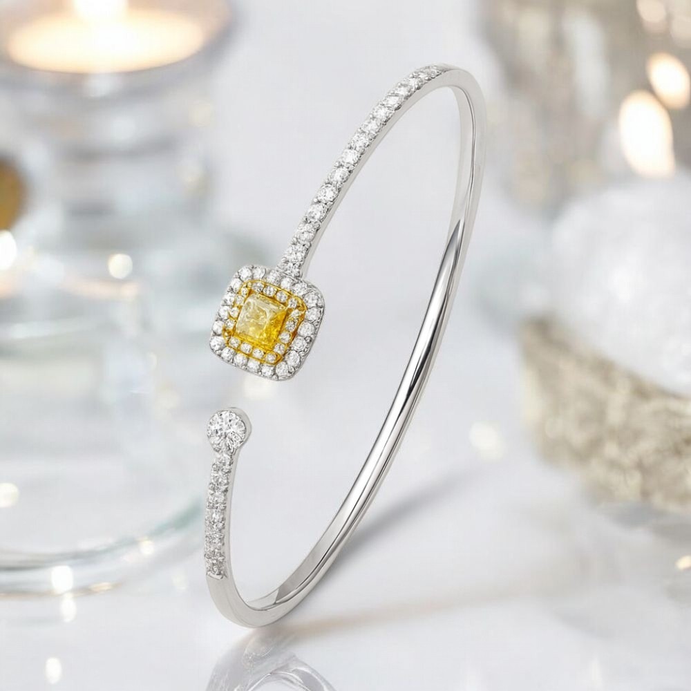 國寶銀樓致力於提供頂級的珠寶首飾,這款黃鑽手環正是我們對卓越工藝的最佳詮釋。黃鑽的亮麗色澤與白金鑽石的純淨光芒交相輝映,為佩戴者增添一份高雅飾品的獨特風采。