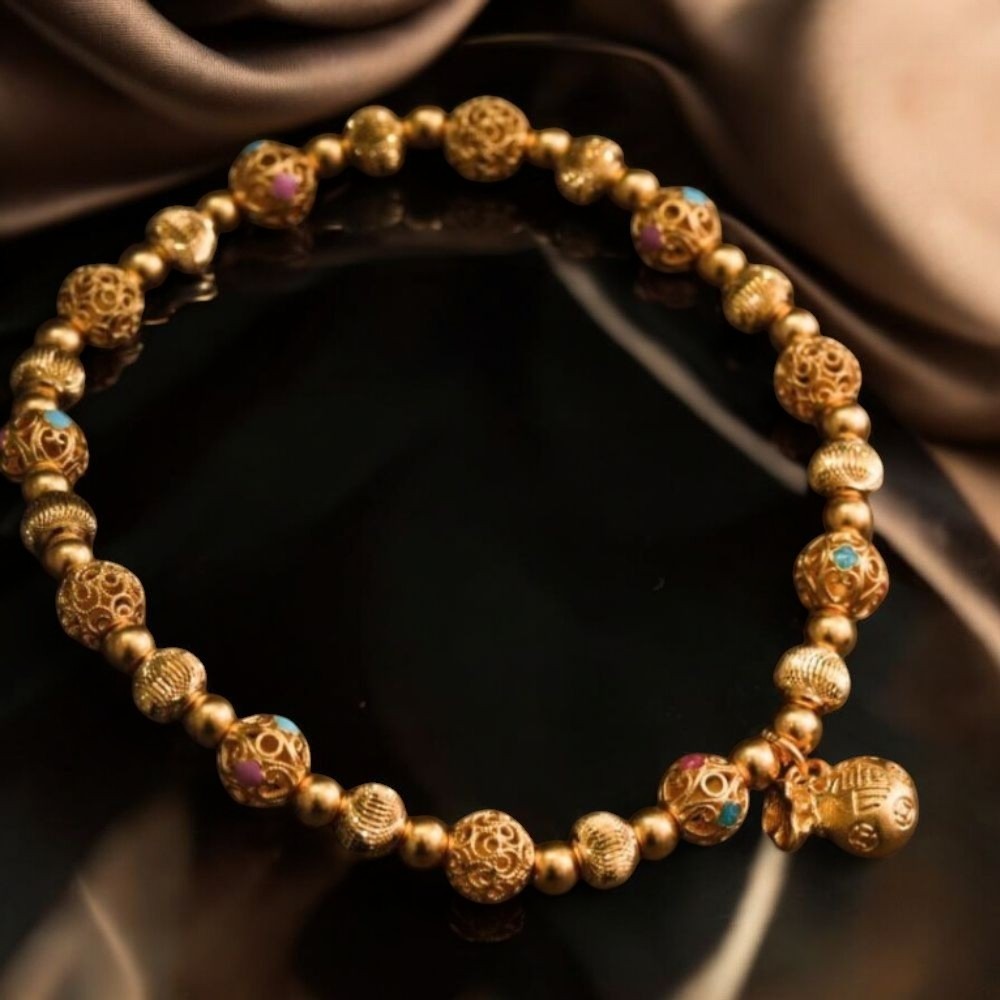 每一顆黃金珠子都經過細膩雕刻,搭配色彩繽紛的寶石鑲嵌,讓整條手鍊在光線下閃耀出迷人的光彩,為佩戴者增添無限魅力。