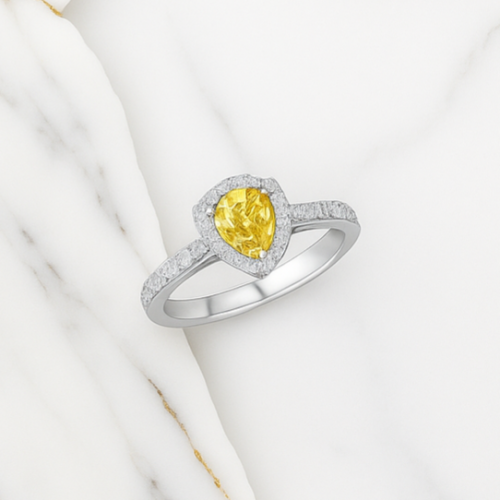 這款獨特奢華的黃鑽石戒指,以璀璨的梨形黃鑽為主石,搭配精緻的白金戒指,無疑是展現個性與品味的最佳選擇。