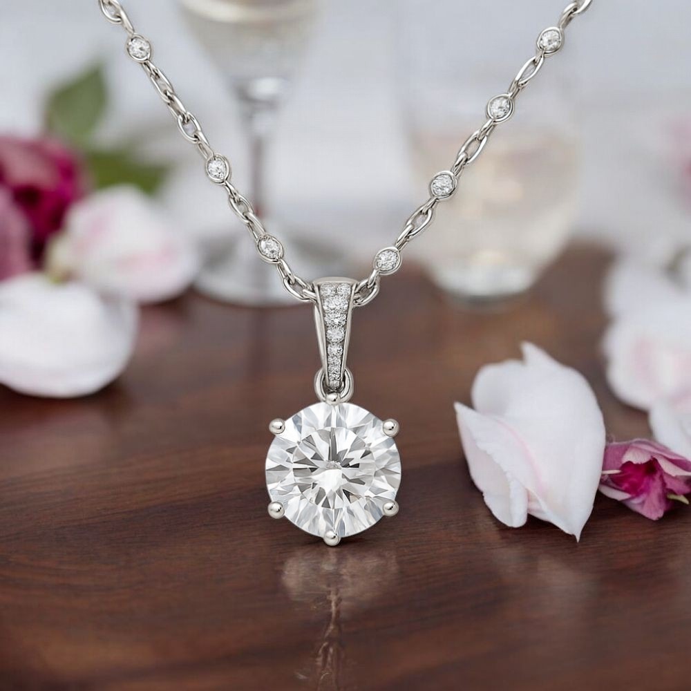 項鍊的設計以經典圓形切割鑽石為焦點,這顆高品質的主鑽石經過精密打磨,展現出璀璨的光芒,猶如星辰般閃耀,讓佩戴者在任何場合中都能成為眾人注目的焦點。