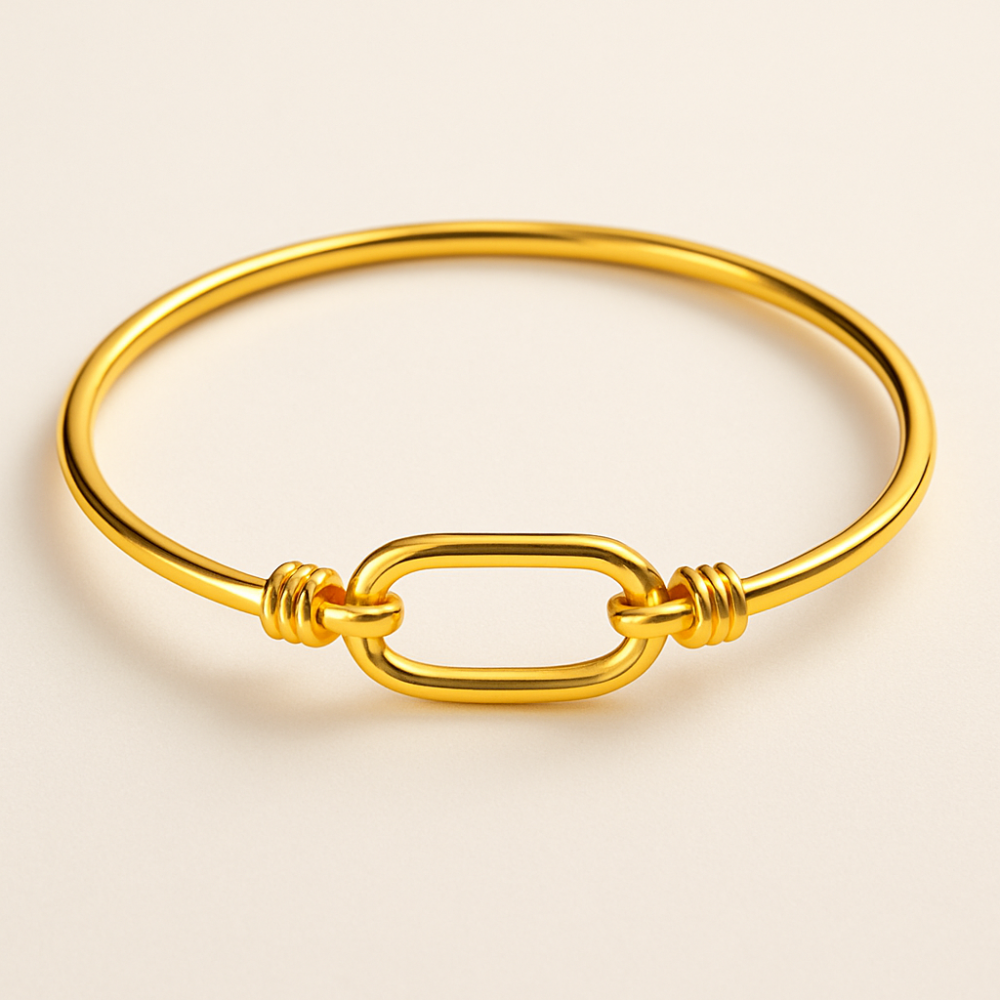 這款簡約黃金手環以流暢的線條和獨特的橢圓形設計為特色,展現低調卻不失優雅的時尚感,承襲了我們公司對於精緻工藝和時尚潮流的追求。