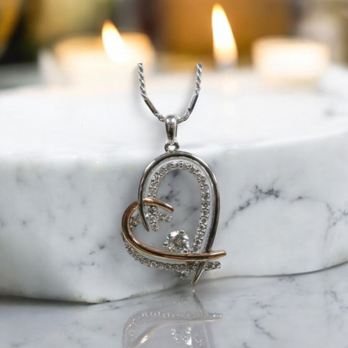 這款愛心鑽石項鍊以優雅的雙色金屬設計為特色,完美結合閃耀的鑽石與流線型的愛心造型,象徵著純淨與永恆的愛。