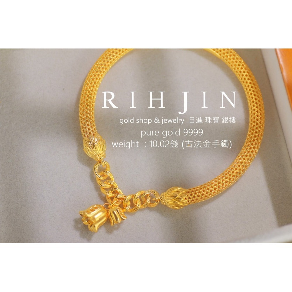 選擇日進珠寶的純金9999古法金手鐲,讓每一個瞬間都充滿優雅與精緻。無論是作為送給摯愛的禮物,還是為自己增添一抹奢華,這款手鐲都將是您的不二之選。
