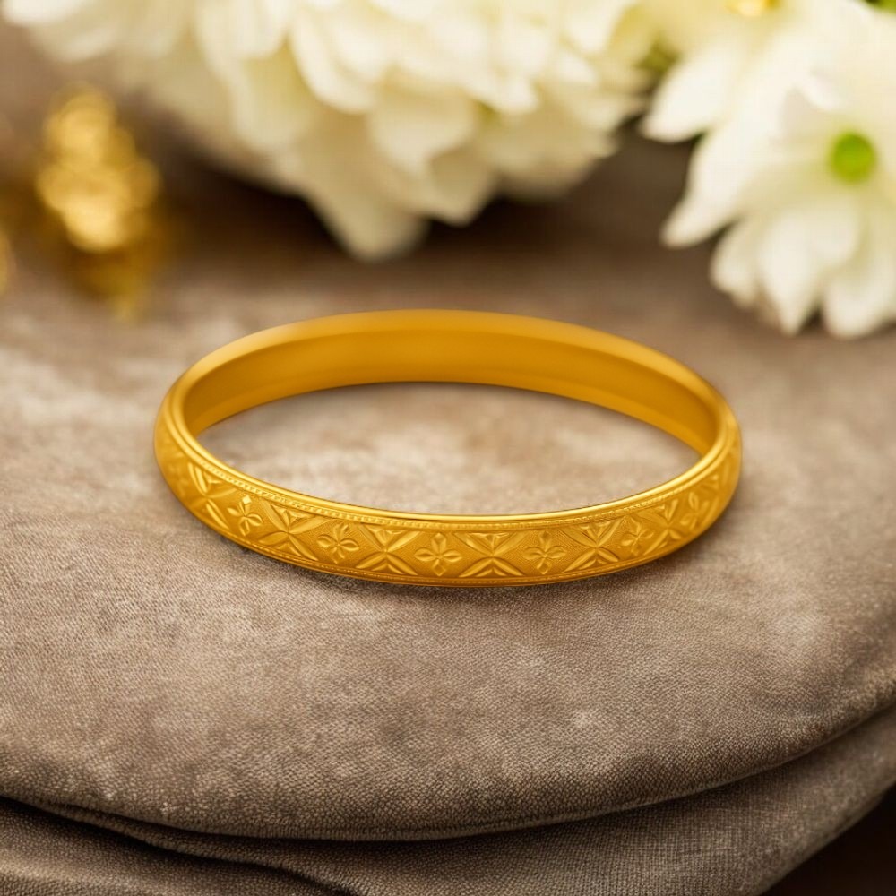 這款黃金雕花手鐲無疑是優雅典雅的高純度黃金飾品,以精緻的花紋設計完美結合傳統工藝與現代設計,為您的造型增添獨特氣質與幸福祝福。