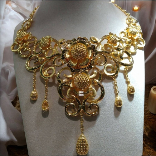 中央大型花朵的造型搭配數個小花與垂墜元素,讓整個項鍊層次感十足,增添了動感和視覺焦點,無論搭配晚禮服、傳統服飾或是時尚裝扮,都能使佩戴者的高貴氣質與獨特風格淋漓盡致地展現出來。
