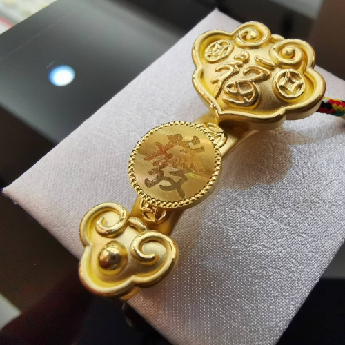 - 這款黃金手鍊以高純度黃金精心製作,巧妙地融合了傳統珠寶中的吉祥元素「福」與「發」。