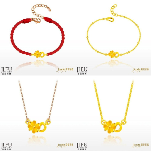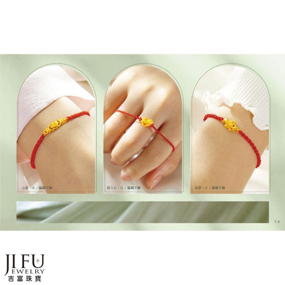 每款皆有編織紅繩金手鍊(小資價約4000)、黃金手鍊、黃金墜子+玫瑰鋼項鍊(小資價約4000)、黃金墜子+黃金項鍊,