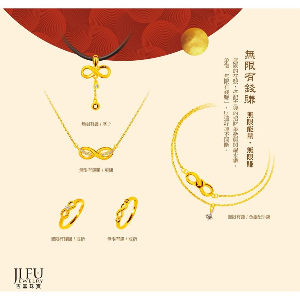 無限的符號,搭配招財象徵的古錢與閃耀水鑽,