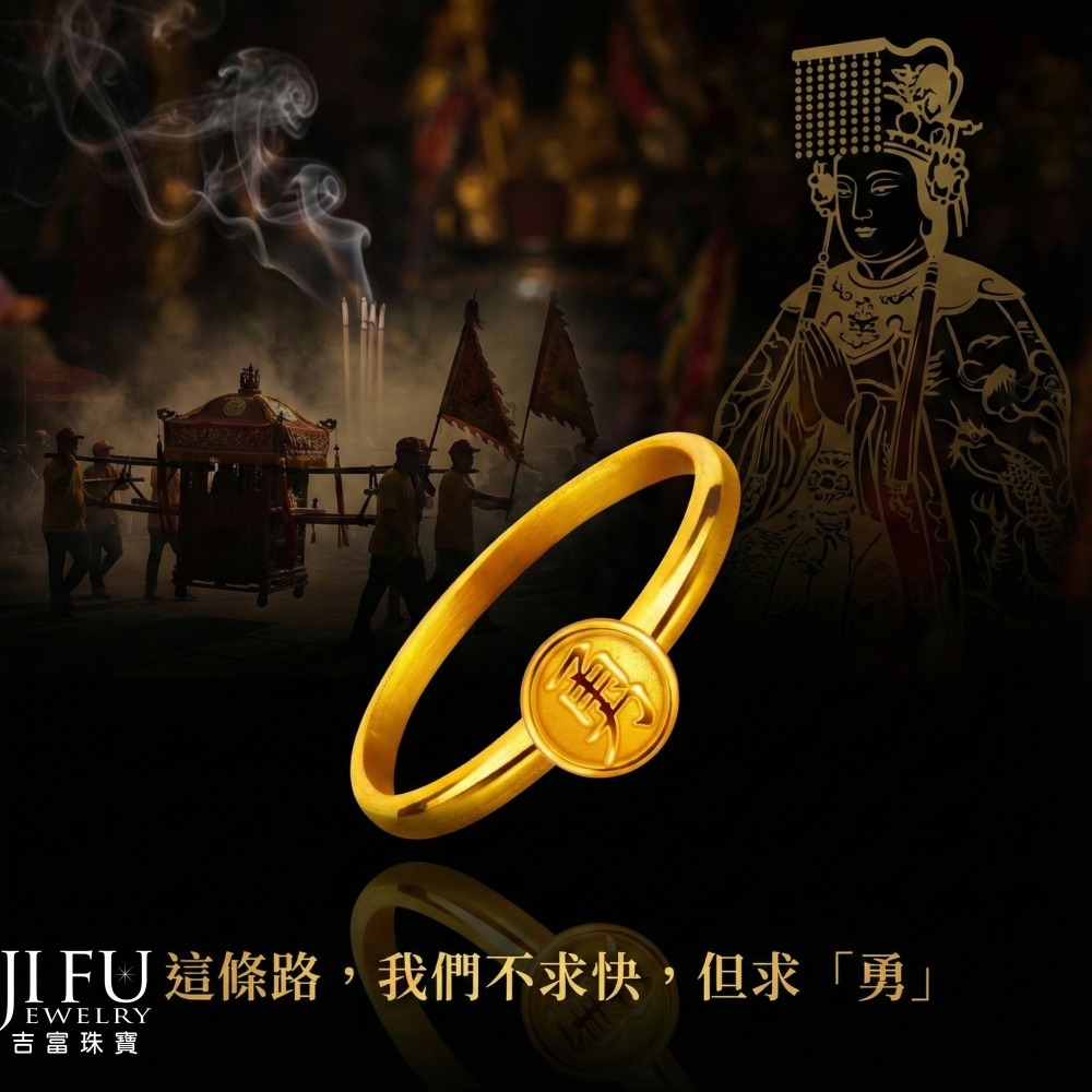 將白沙屯媽祖的慈悲與力量隨身攜帶,這不僅是一枚黃金戒指,更是心靈的寄託與信仰的傳承。無論日常佩戴或於進香時分,讓這份「勇」氣時刻相伴,感受媽祖的庇佑,守護您平安順遂,勇往直前,開創美好人生。