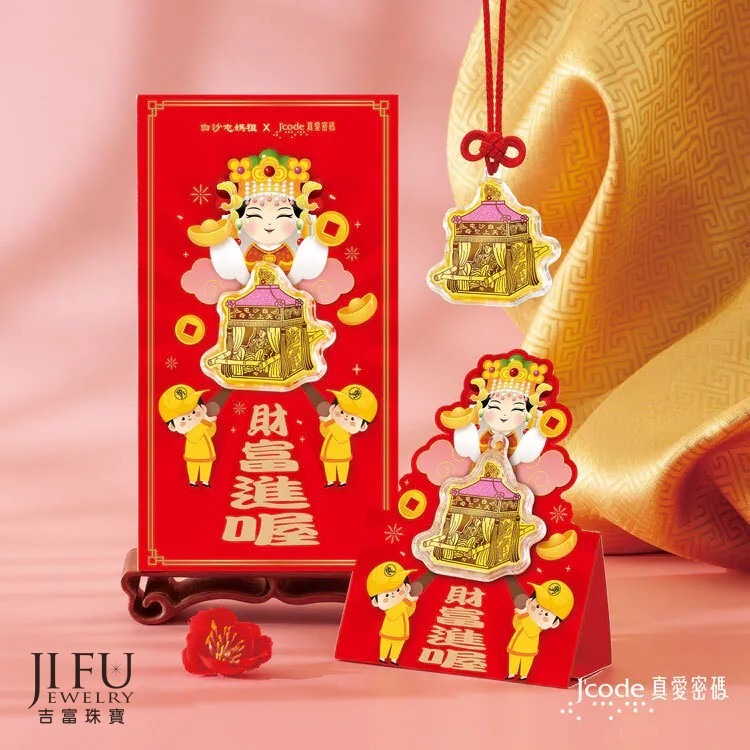 ・ 吉富珠寶銀樓與真愛密碼聯名,推出白沙屯媽祖「粉紅超跑神轎」純金紅包袋,結合信仰與時尚。