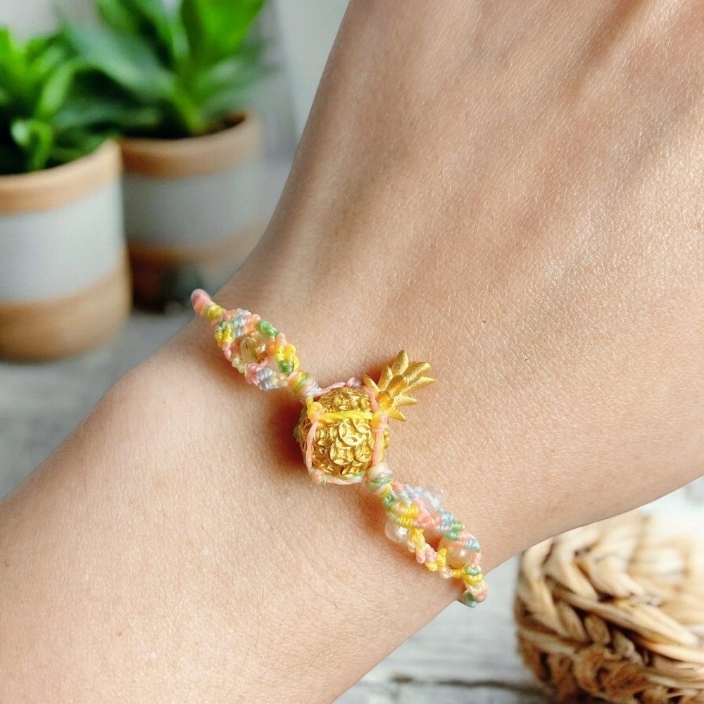它將黃金鳳梨吊飾與繽紛多彩的彩色編織繩巧妙結合,創造出一種獨特而引人注目的美感,這不僅是時尚手鍊,更是豐收象徵,讓佩戴者感受到繁榮與幸運的氣息。