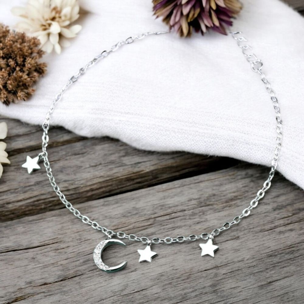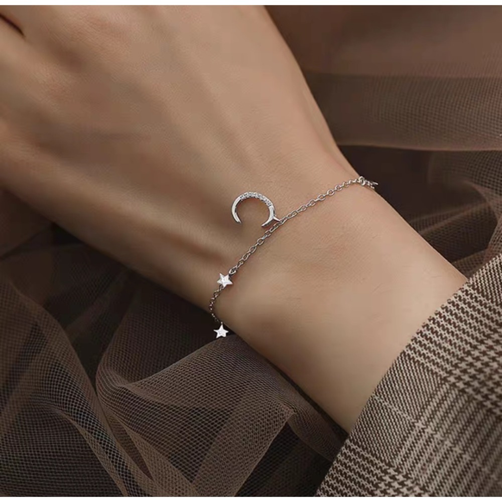 以皎潔的月亮與閃爍的星辰為靈感設計,將夜空的浪漫化作腕間的點綴。 925純銀材質,簡約細緻,搭配小巧星星與彎月吊飾,低調中帶有一絲夢幻。