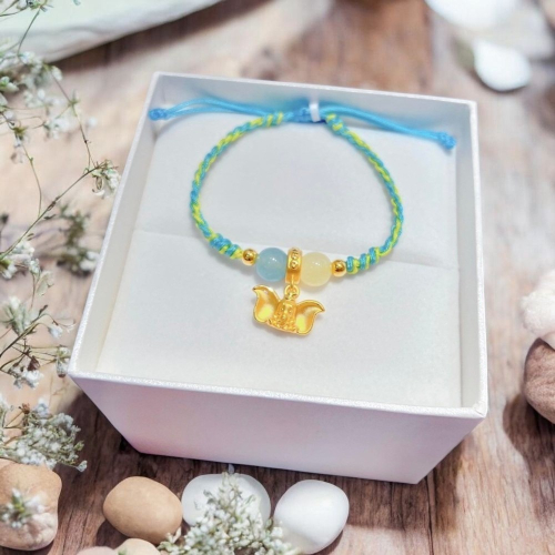 這款黃金大象手鍊以精緻的黃金大象吊飾為核心,搭配藍綠色手鍊的編織設計,展現出獨特的魅力。