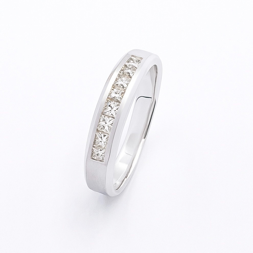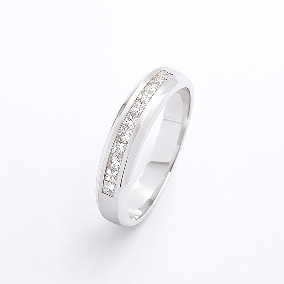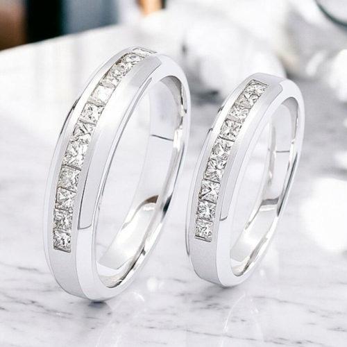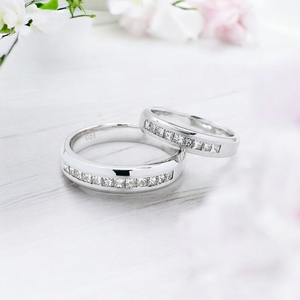 戒指中央嵌入多顆閃耀的公主方形鑽石,這些鑽石經過精細切割,能夠捕捉光線,營造出璀璨奪目的視覺效果,象徵著愛情的永恆與承諾。