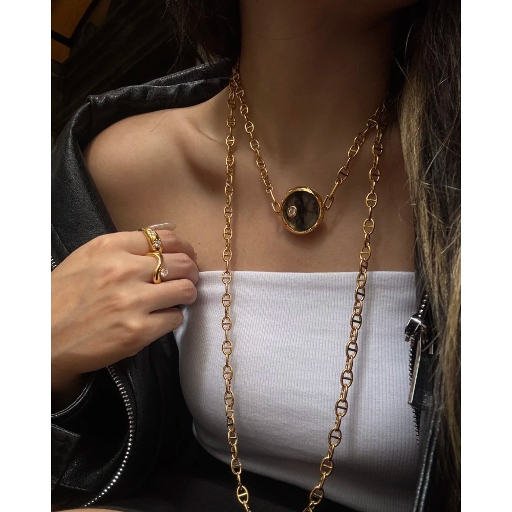 - 鍊節設計細膩且富有層次感,搭配中央的獨特圓形墜飾,展現出不凡的魅力與視覺焦點。
