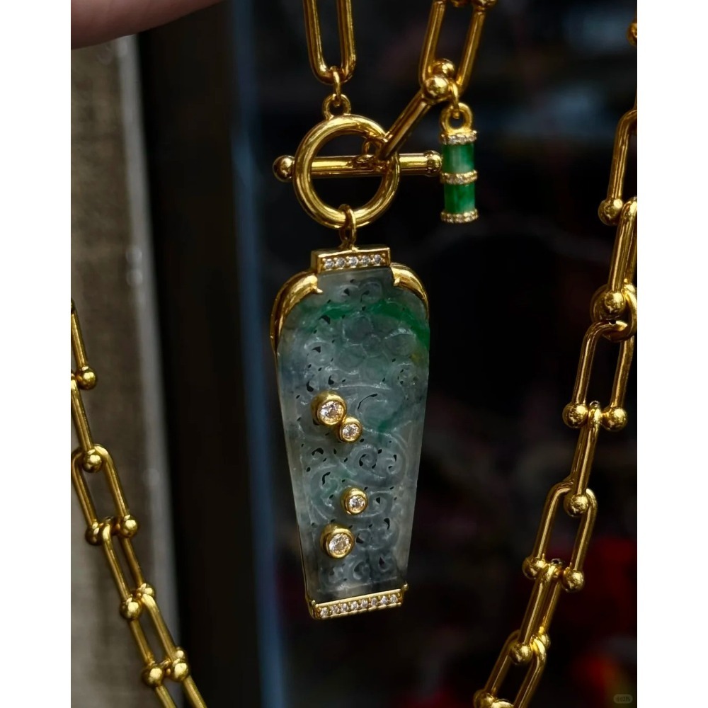 這款翡翠金鑲玉項鍊是奢華珠寶的完美典範,完美結合了天然翡翠與18K金飾的精緻設計,展現出無與倫比的優雅與品味。