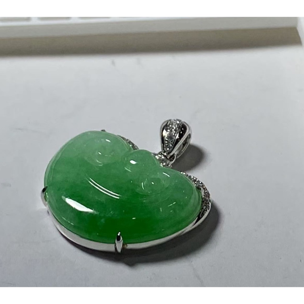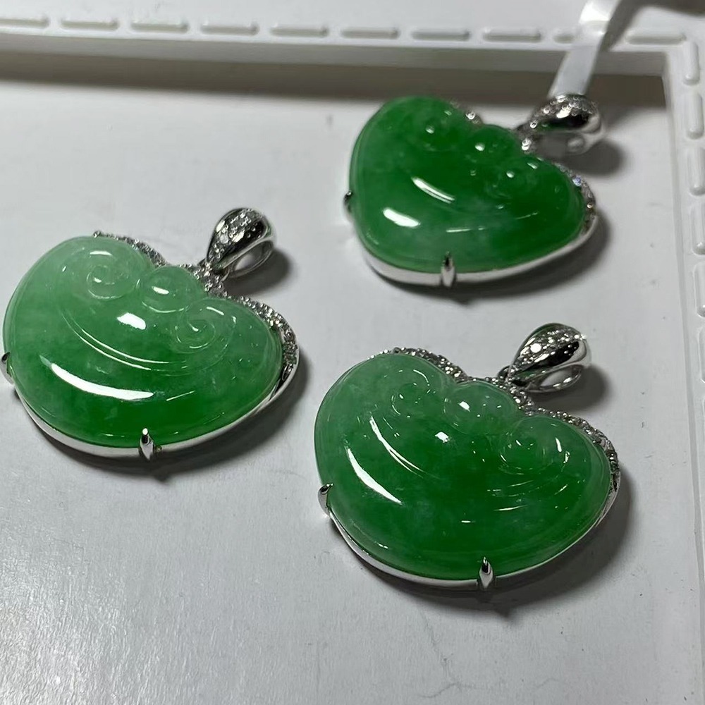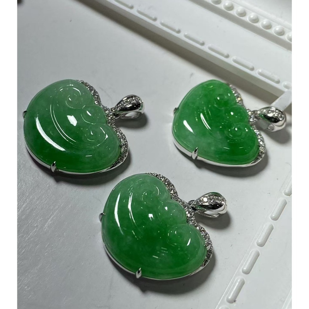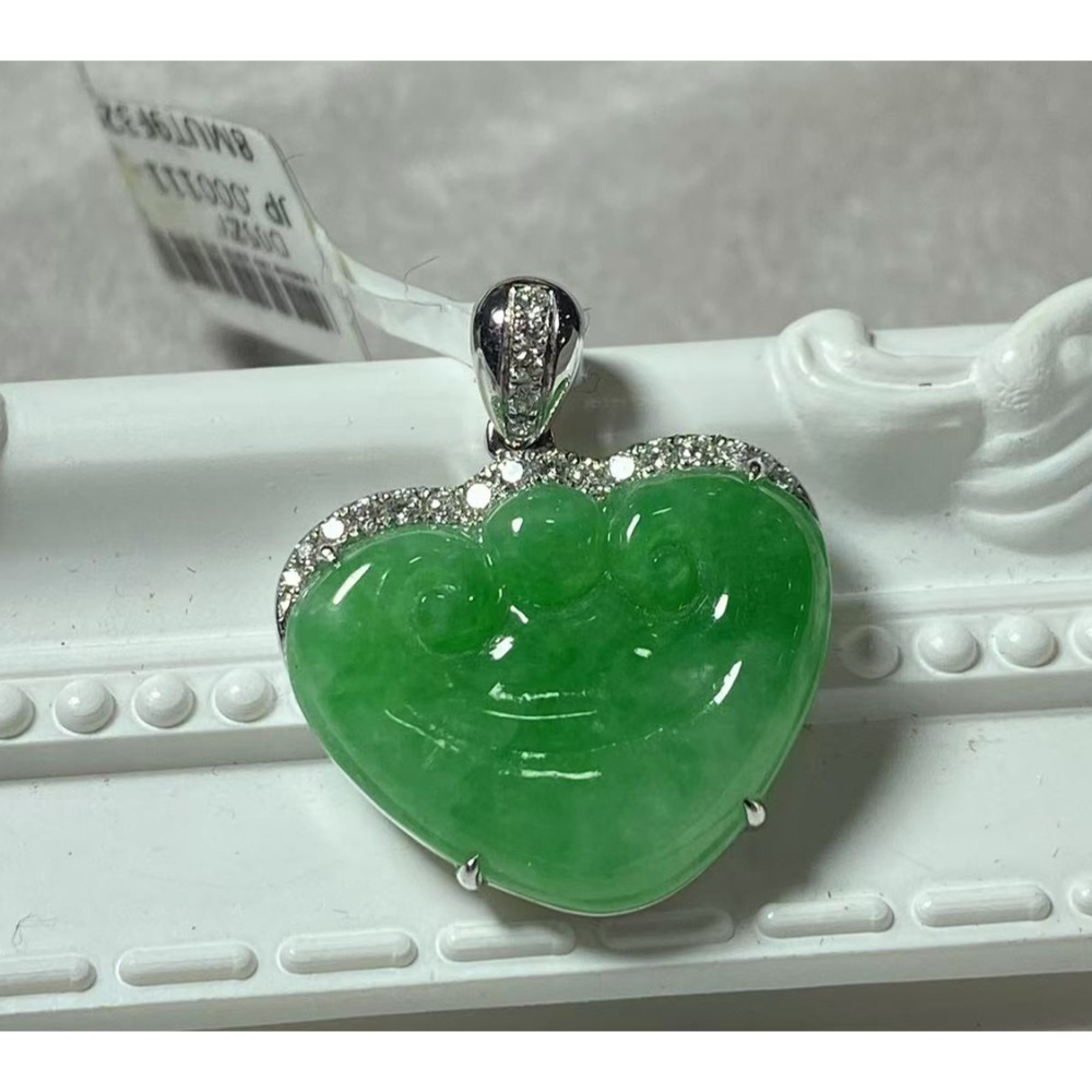 這款天然A貨翡翠玉墜,以清新的陽綠色調為主,雕刻如意造型寓意平安如意。