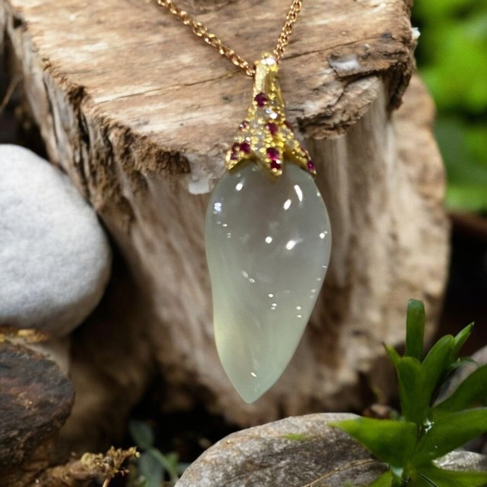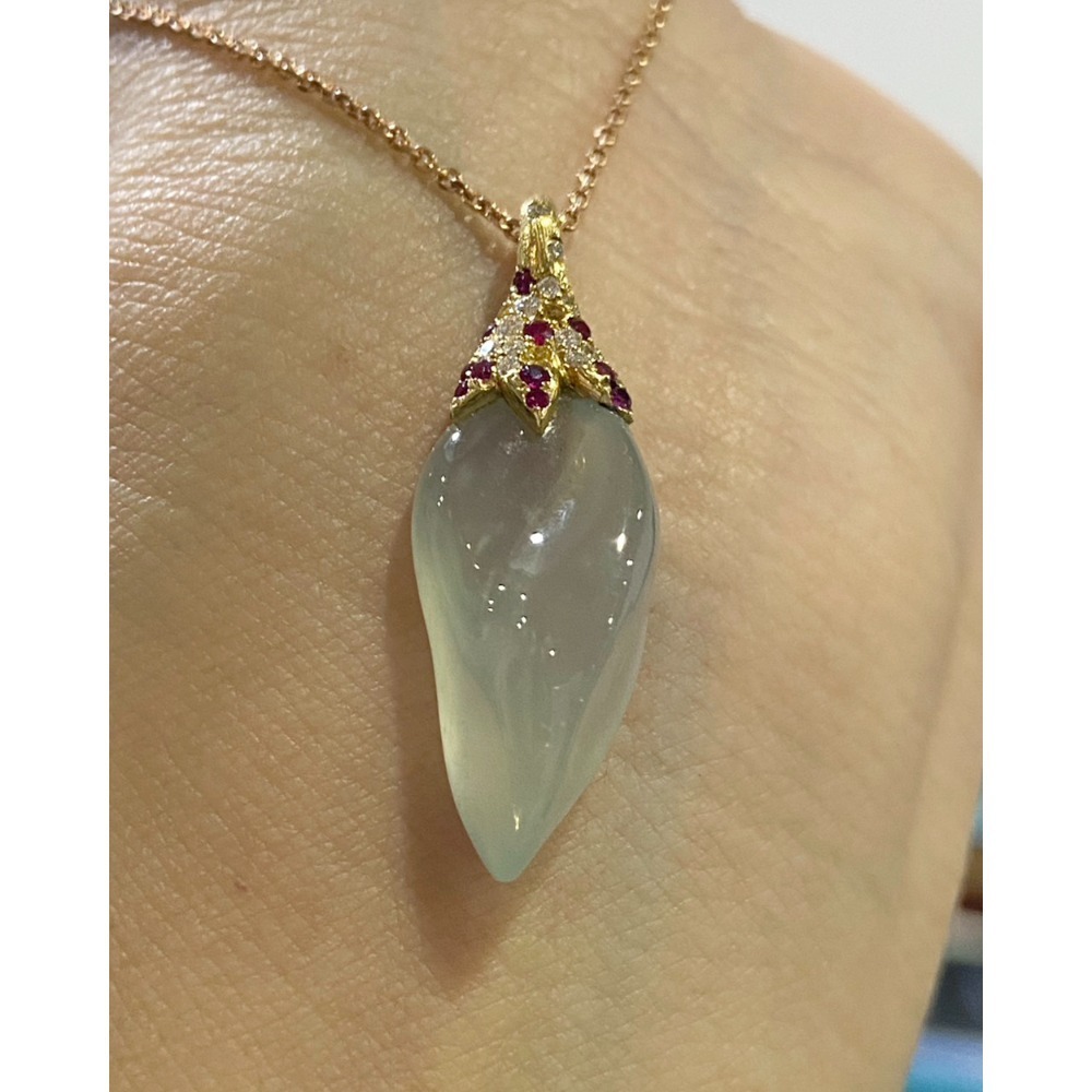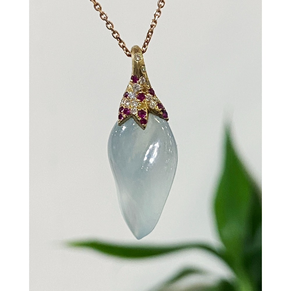 選擇這款天然翡翠吊墜項鍊,您將擁有的不僅是時尚配件,更是一段無可比擬的奢華體驗。翡翠玉石的自然之美與紅寶石鑽石的耀眼光芒相得益彰,讓每一次佩戴都成為一場珠寶設計的饗宴。