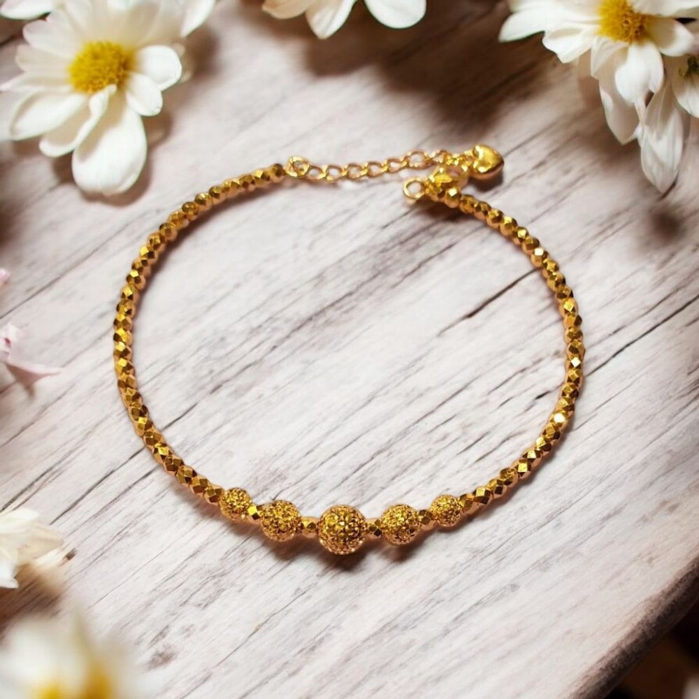 手鍊中央鑲嵌的五顆圓珠,經過精心雕琢,細節處理細膩,呈現出獨特的立體花紋,增添了整體設計的層次感與時尚感,讓佩戴者無論在日常生活中還是特殊場合,都能閃耀動人。