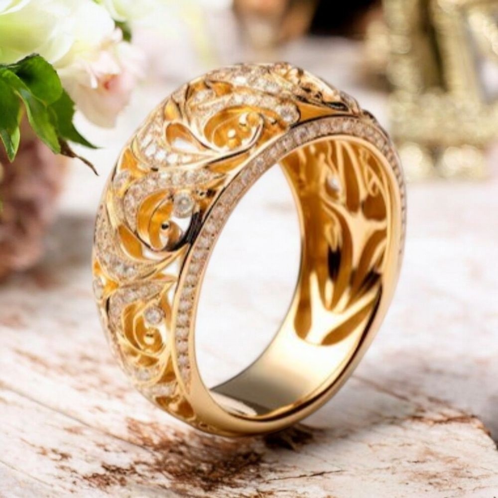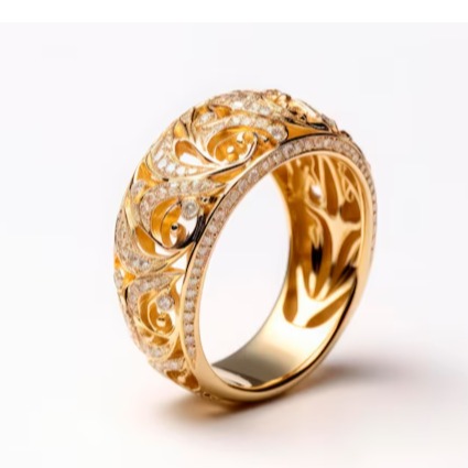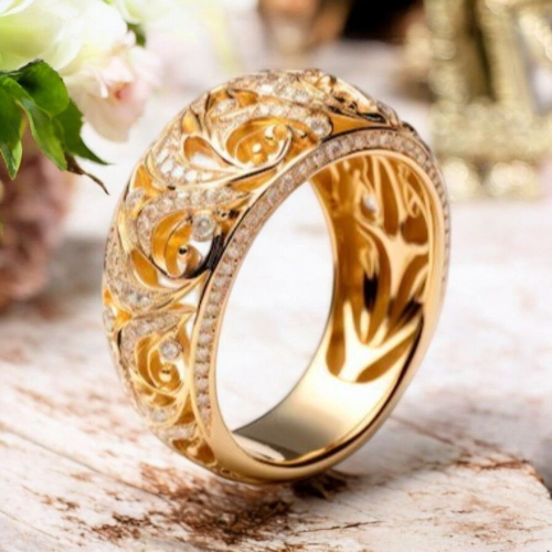 這枚金戒指在設計上精雕細琢,無論是求婚、結婚,還是紀念日,它都能完美地詮釋那份獨特的情感。奢華金戒指的每一個細節都展現了珠寶設計的精湛工藝,將黃金的奢華與婚戒的永恆意義完美結合。