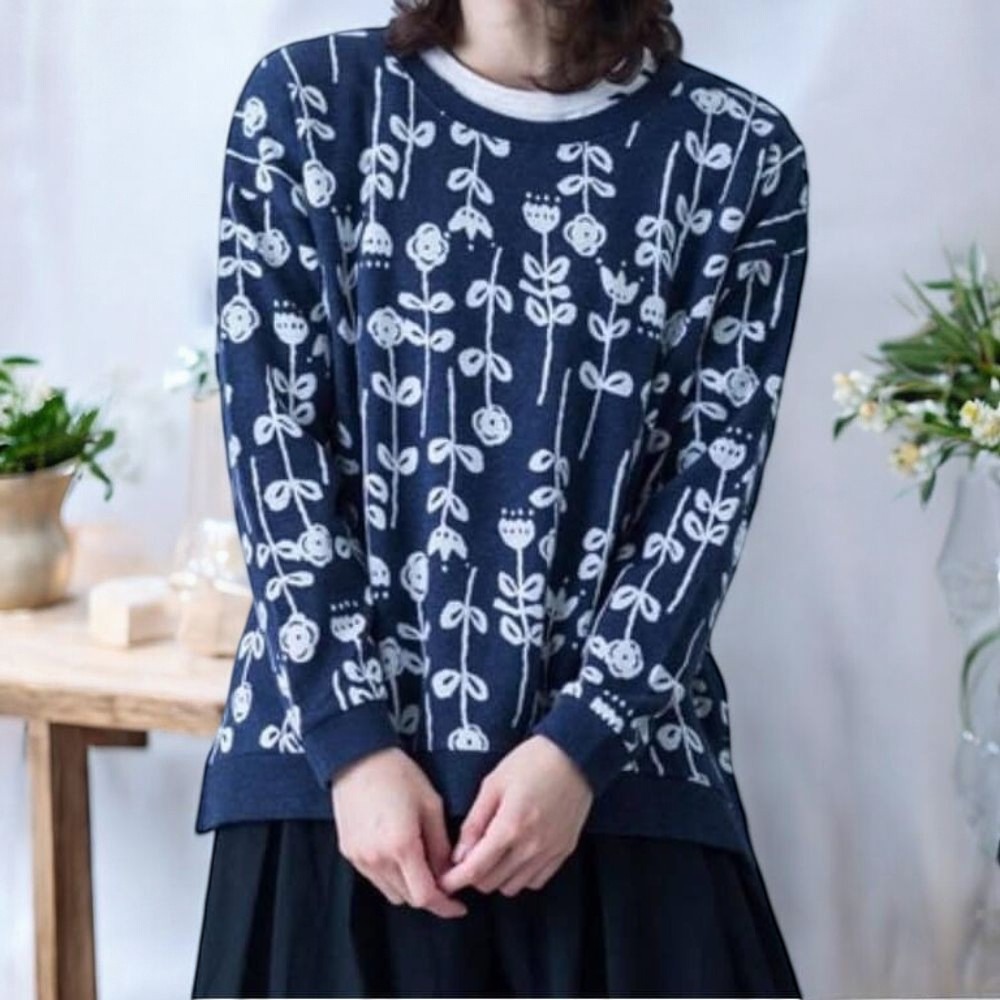這件針織衫的設計靈感源自對自然的熱愛,搭配深藍色底色與簡約且具藝術感的花卉圖案,形成一種優雅且富有生氣的視覺效果,讓每個穿著者都能感受到春季的氣息。
