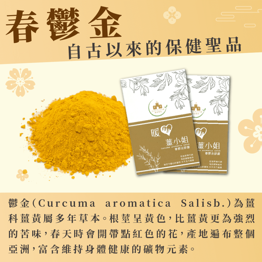 春鬱金自古以來被譽為增強體力和調節生理機能的天然良方,能有效守護我們的寶貝健康。這款產品融合了傳統的精華,並特別設計以適應現代生活方式,讓每一位使用者都能感受到暖心的呵護。