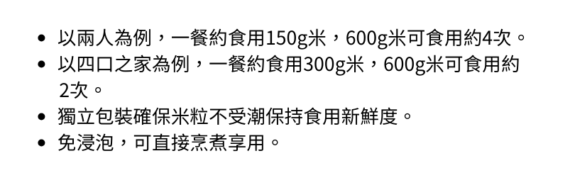 以兩人為例,600g米可食用約4次。