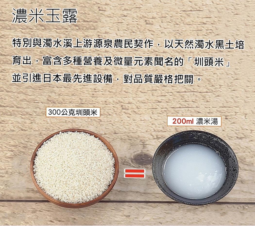 以彰化濁水、黑土培育的圳頭米 6小時熬製,萃取20%精華米湯。