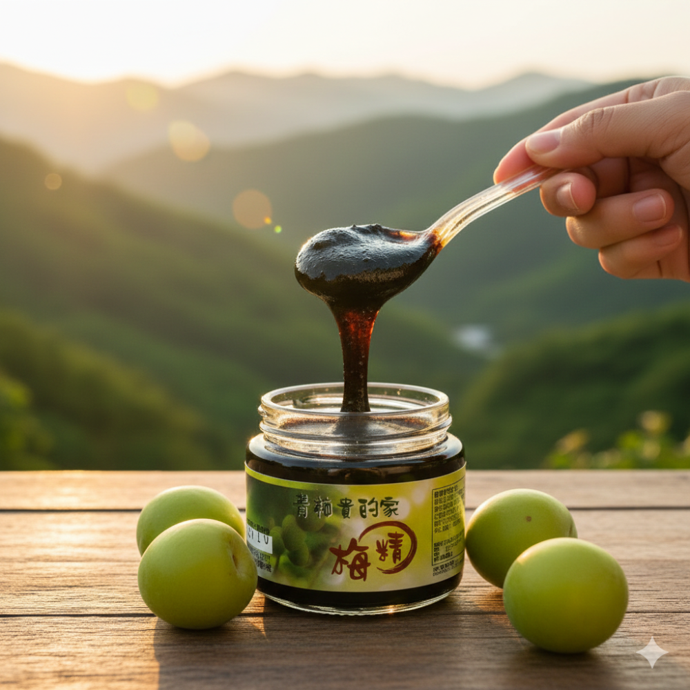 【產品特色】青梅汁經長時間手工熬煮濃縮而成,3斤青梅才可製成一瓶50g的梅精,成黑色黏稠膏狀,帶有些微煙燻味。