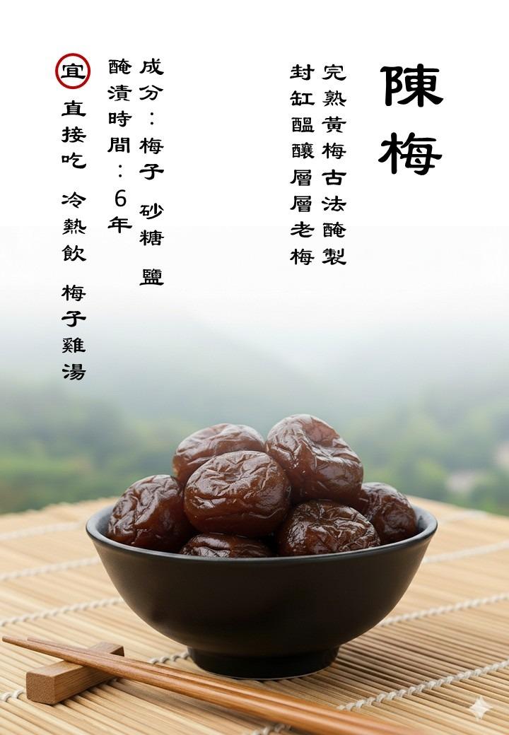 【食用方式】滋味醇厚,偏軟爛酸鹹,梅肉可以直接食用、拌麵拌飯或搭配肉類解膩;醬汁加水成梅汁或作為涼拌菜醬汁皆宜。陳梅罐亦是料理梅嶺特色「梅子雞」不可或缺的秘密武器。