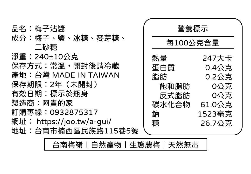 【產地】臺南市楠西區梅嶺阿貴的家【淨重】240g±10g