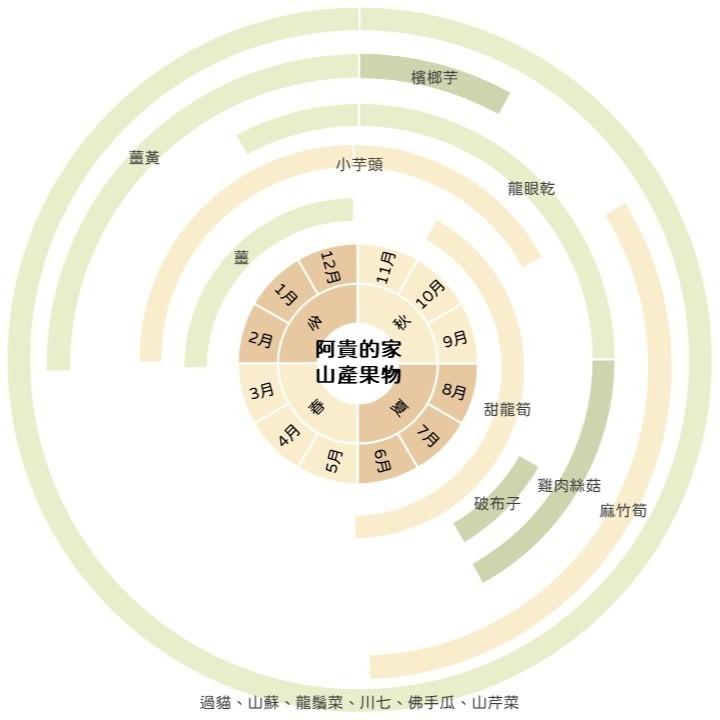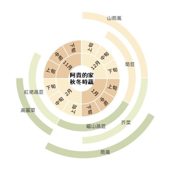 5~6樣果蔬根莖、1~2樣水果、不定時出現的土雞蛋。