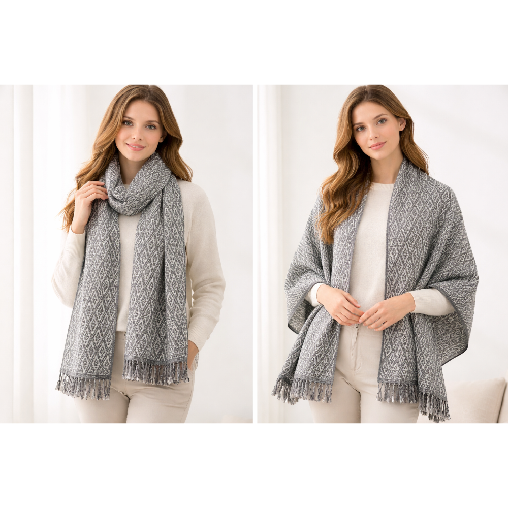 在秋冬季節中既保暖又時尚!其優雅的灰色調與細緻的菱格圖案設計,完美搭配菱格紋披肩圍巾的獨特魅力,提升您的穿搭質感。柔軟親膚的面料不僅提供絕佳的保暖效果,更能靈活變換,無論是圍巾還是披肩,皆能輕鬆適應各種場合。別再猶豫,讓這款時尚配件成為您冬季衣櫥的必備之選!