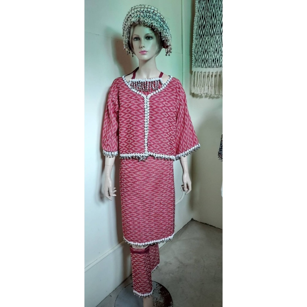 每一針每一線都展示著手工藝的精湛,讓您在文化活動或傳統節慶中,自信展現民族的風情與魅力。這套傳統民族服飾套裝以細膩的紅色幾何圖案為主體,融合獨特的手工刺繡和貝殼裝飾,展現出濃厚的文化韻味。