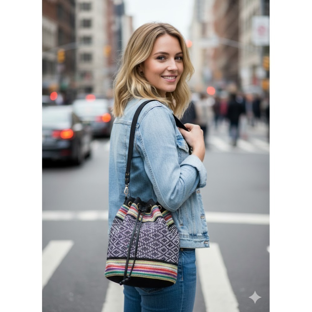 束口設計使包包的開合變得格外方便,內部空間寬敞,能輕鬆收納手機、錢包、化妝品等日常必需品,無論是日常通勤、外出旅遊或是約會聚會,這款民族水桶包都能為您的整體造型增添無限光彩。