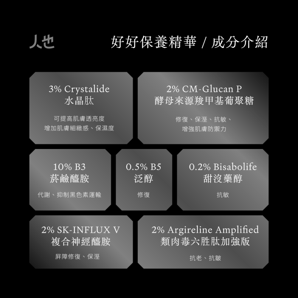 - • 3% Crystalide:水晶肽,可提高肌膚透亮度、增加肌膚細緻感、保濕度
