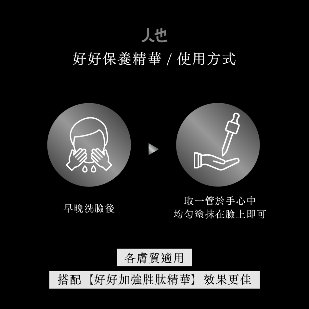 早晚洗臉後,取一管於手心中,均勻塗抹在臉上即可,搭配【好好加強胜肽精華安瓿】效果更佳。