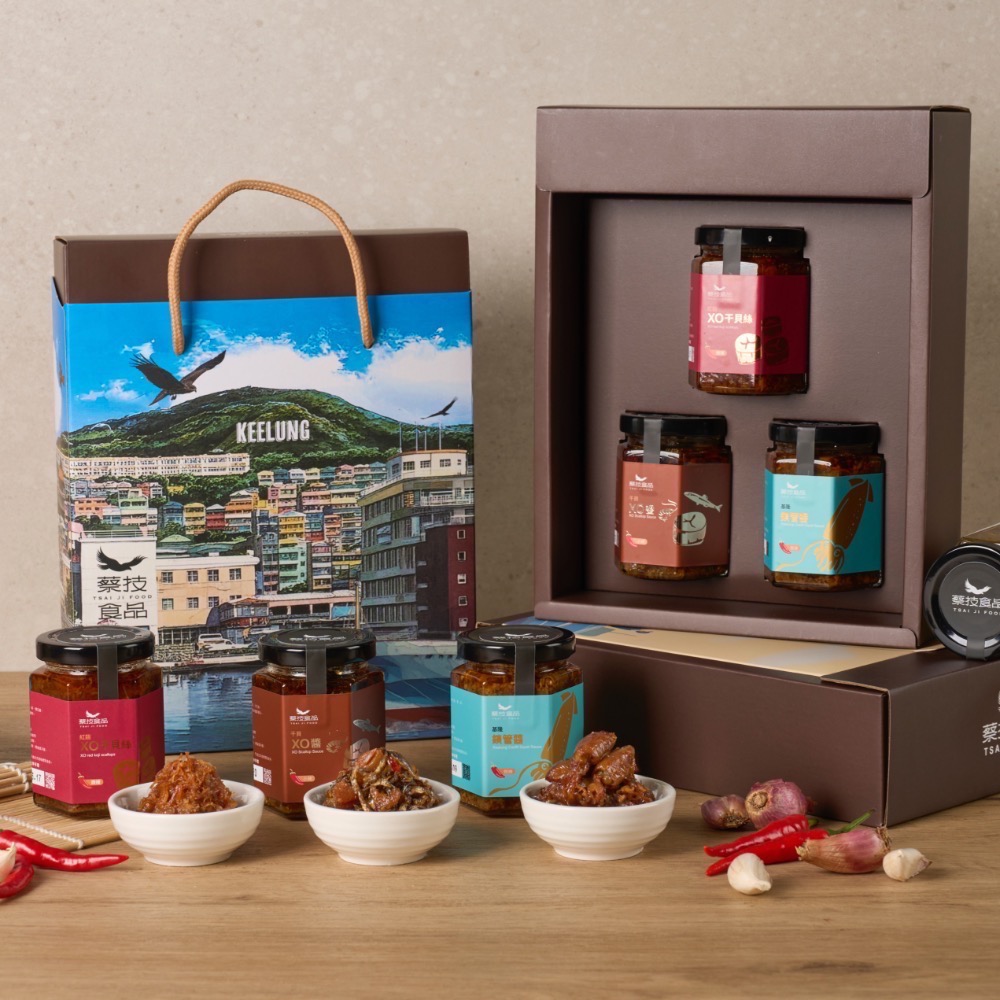 禮盒內容包含 基隆鎖管醬、XO 干貝醬 與 XO 干貝絲,