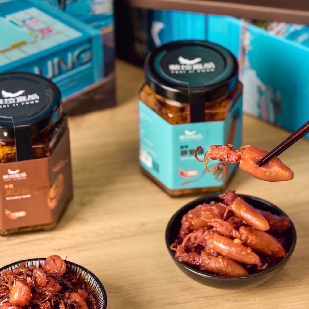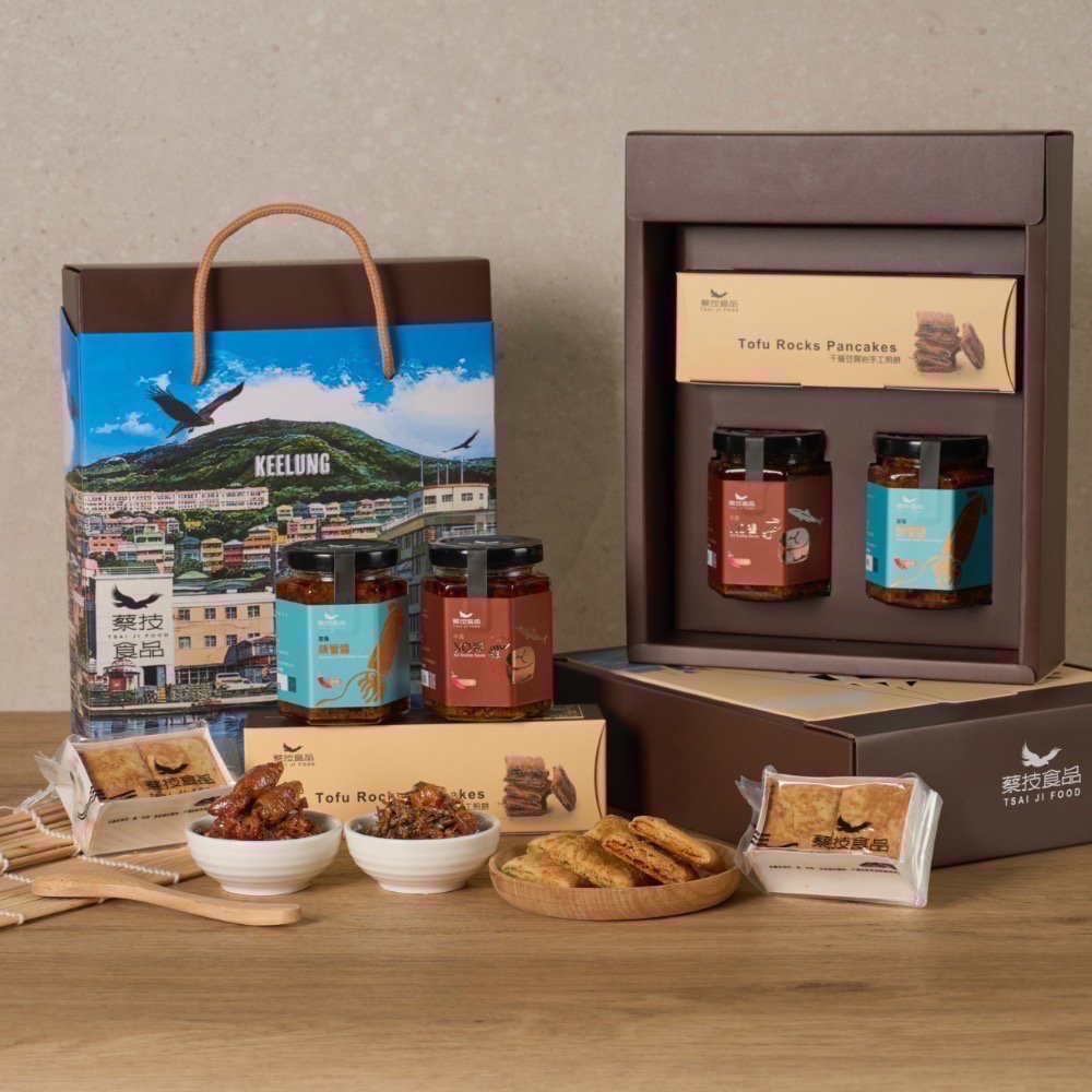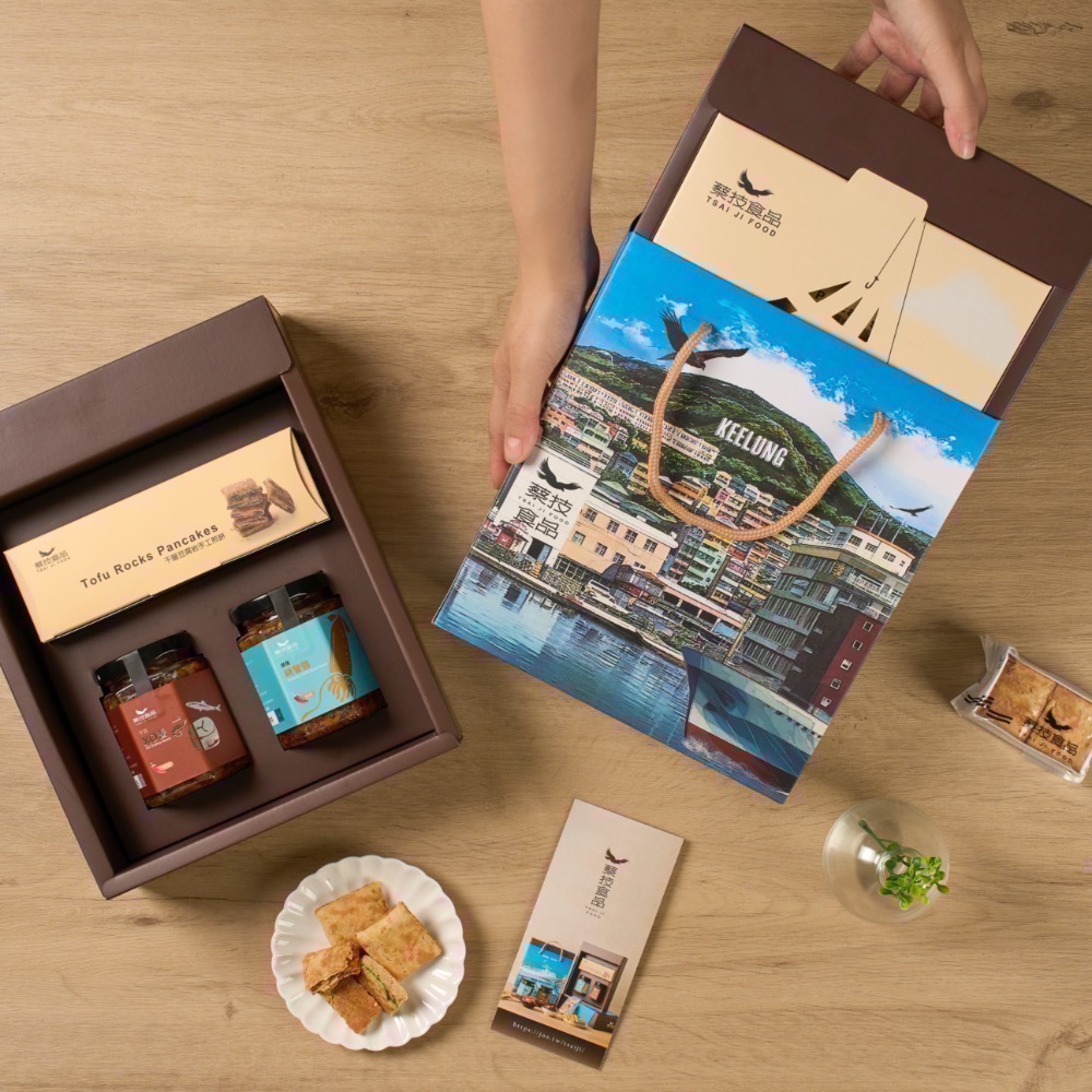 禮盒內容包含 千層豆腐岩手工煎餅、基隆鎖管醬 與 XO 干貝醬,