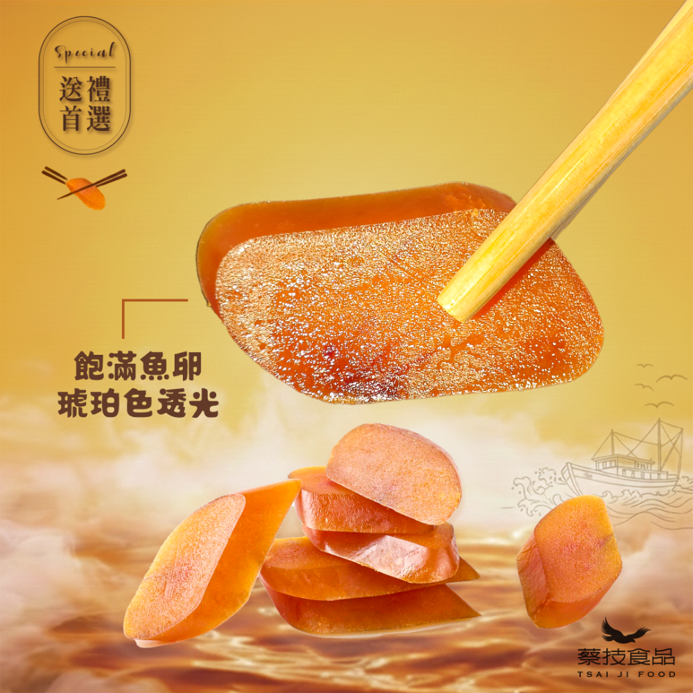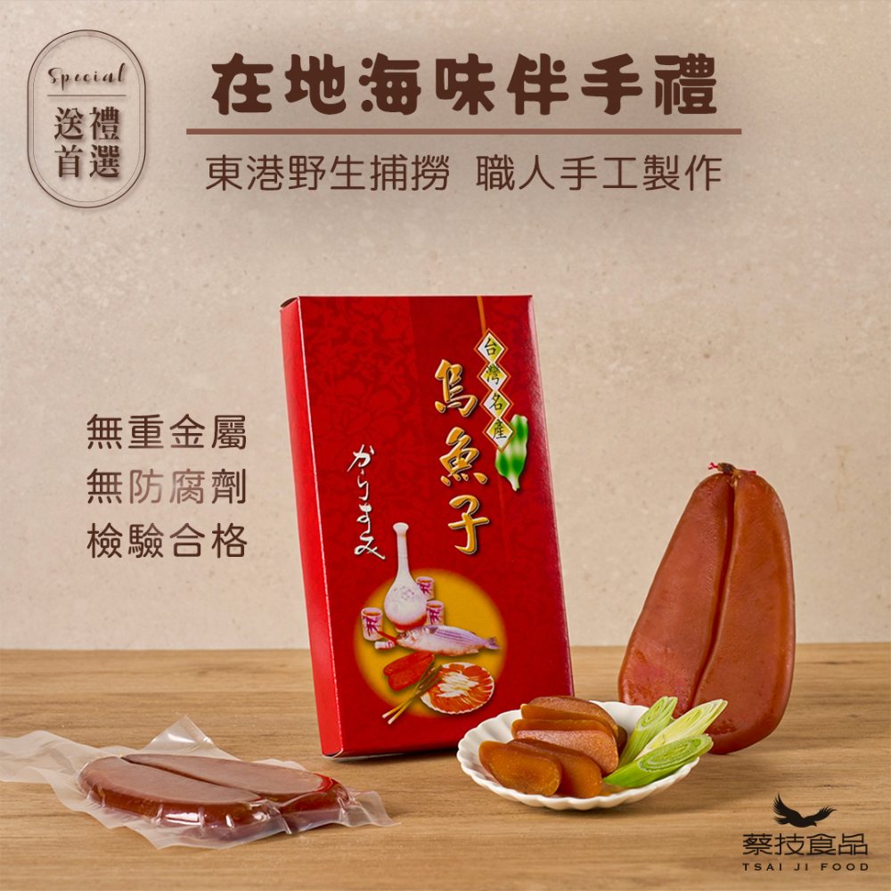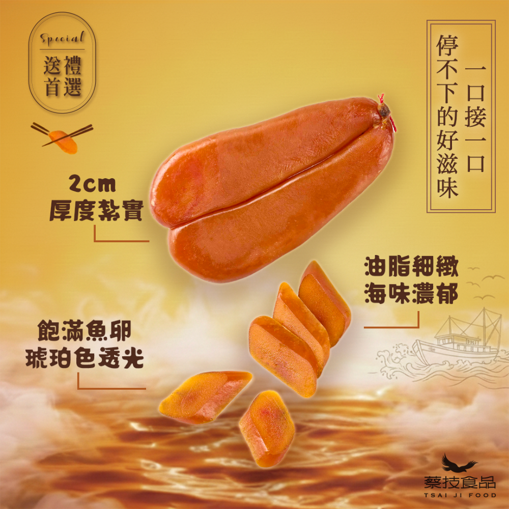 嚴選屏東東港漁船捕撈之野生烏魚卵,僅取冬季產卵期最飽滿狀態,由職人以傳統工法手工鹽漬、自然日曬製成。